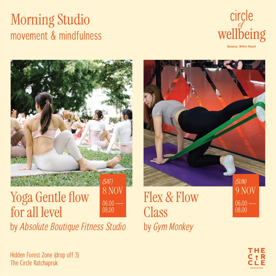 🌿 Morning Studio: คลาสออกกำลังกายท่ามกลางธรรมชาติ วันเสาร์สอนโดย Absolute Boutique Fitness Studio และวันอาทิตย์สอนโดย Gym Monkey