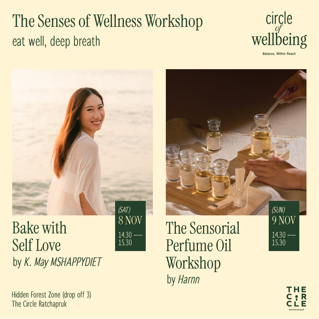 🌿 Workshops: กิจกรรมเวิร์คชอปแบบกลุ่ม วันเสาร์พบกับกิจกรรม Bake with Self Love by K.May MSHAPPYDIET และวันอาทิตย์พบกับกิจกรรม The Sensorial Perfume Oil by HARNN