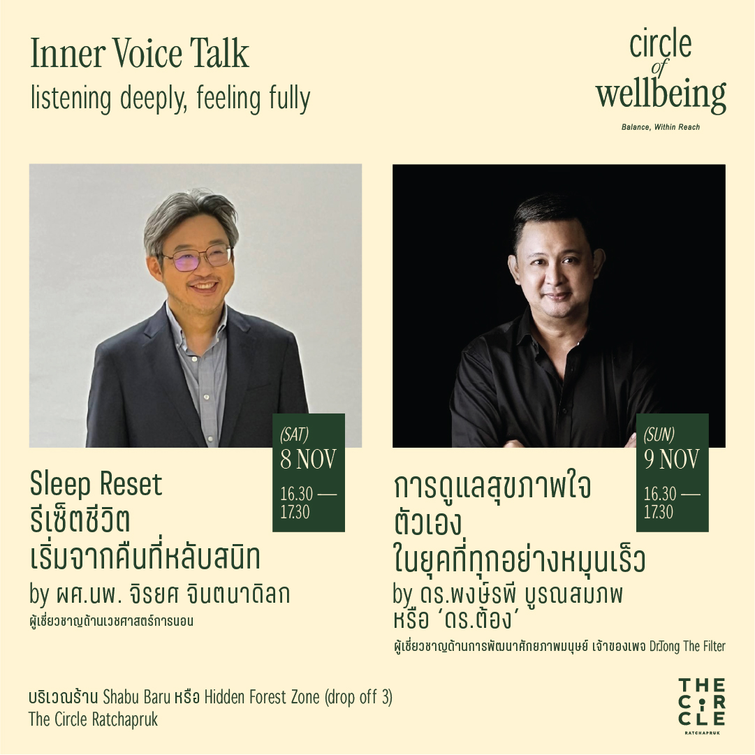 🌿Inner Voice Talk: Live podcast-style sessions with leading speakers “Sleep Reset” by Asst. Prof. Dr. Jirayod Jintanadilok (Sat) & “Caring for the Mind in a Fast World” by Dr. Tong The Filter (Sun)